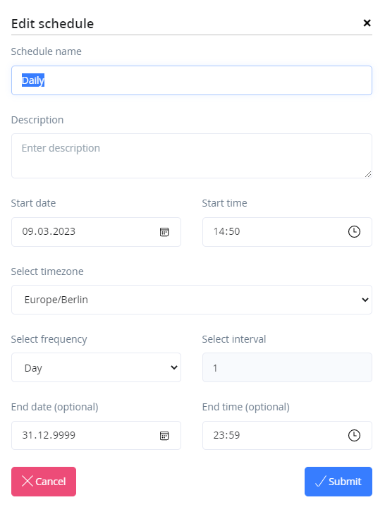 When creating or editing a schedule, you can modify its name, description, start and end date/time and frequency.&#x20;