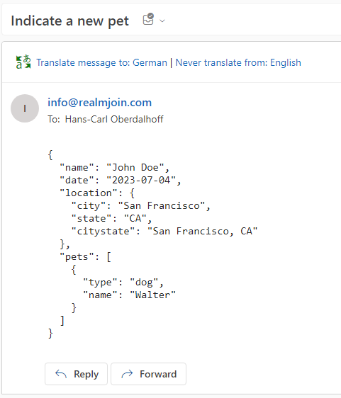 When a user fills out and submits a form, its contents will be sent via email to the recipient given in the form's definition. The email will be sent via RealmJoin's infrastructure and will not originate from your company's email addresses.