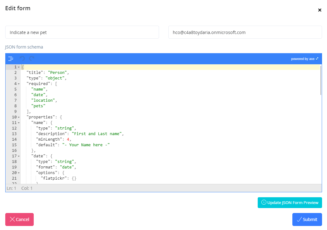 Use "New Form" or "Edit" to describe the form using [JSON Schema](https://json-schema.org/). This defines which fields need to be entered and what values are valid. The UI offers a syntax checking editor and a preview of the resulting form.